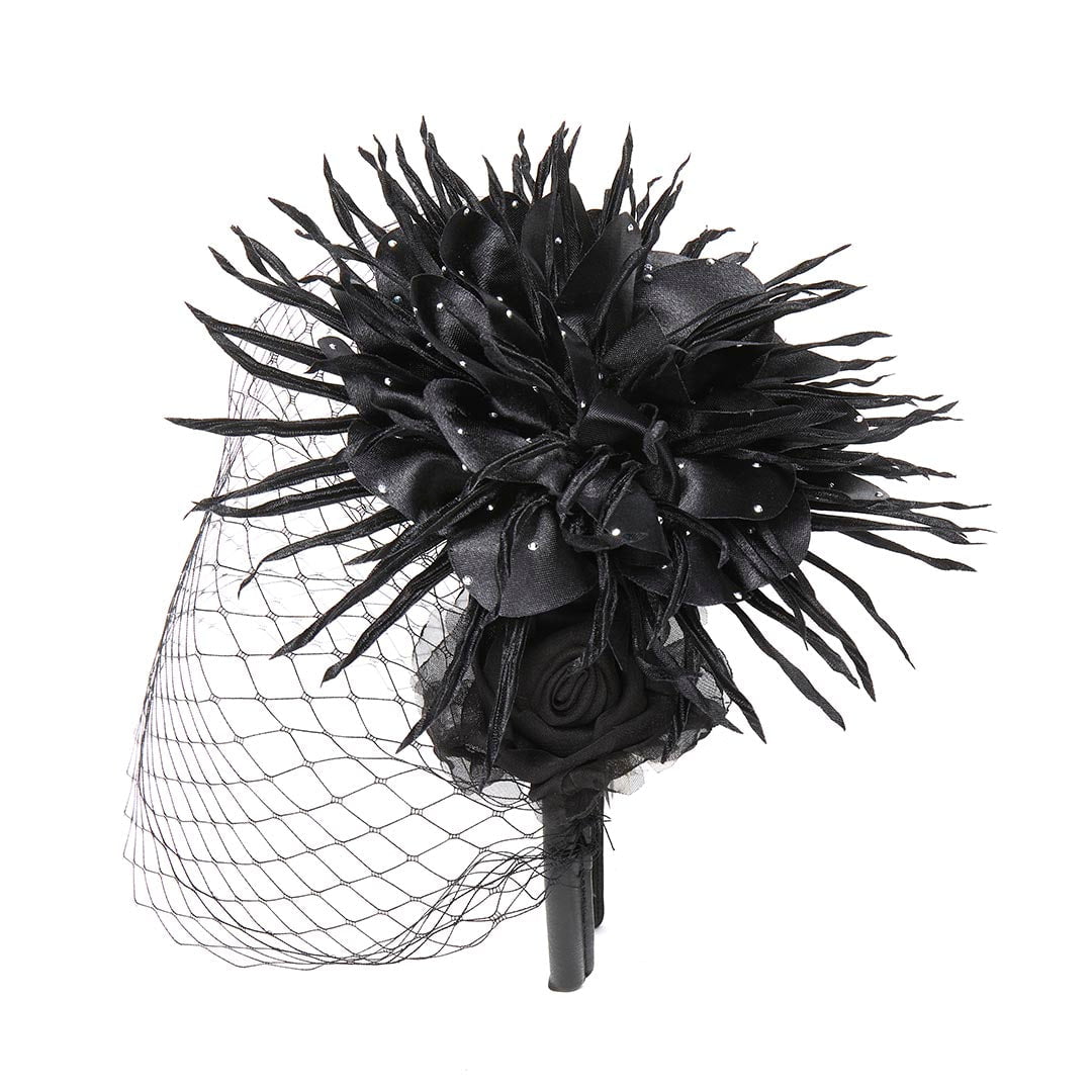 ∙ Jet velvet and silk flowers adorned with crystal rhinestones and feather plumes