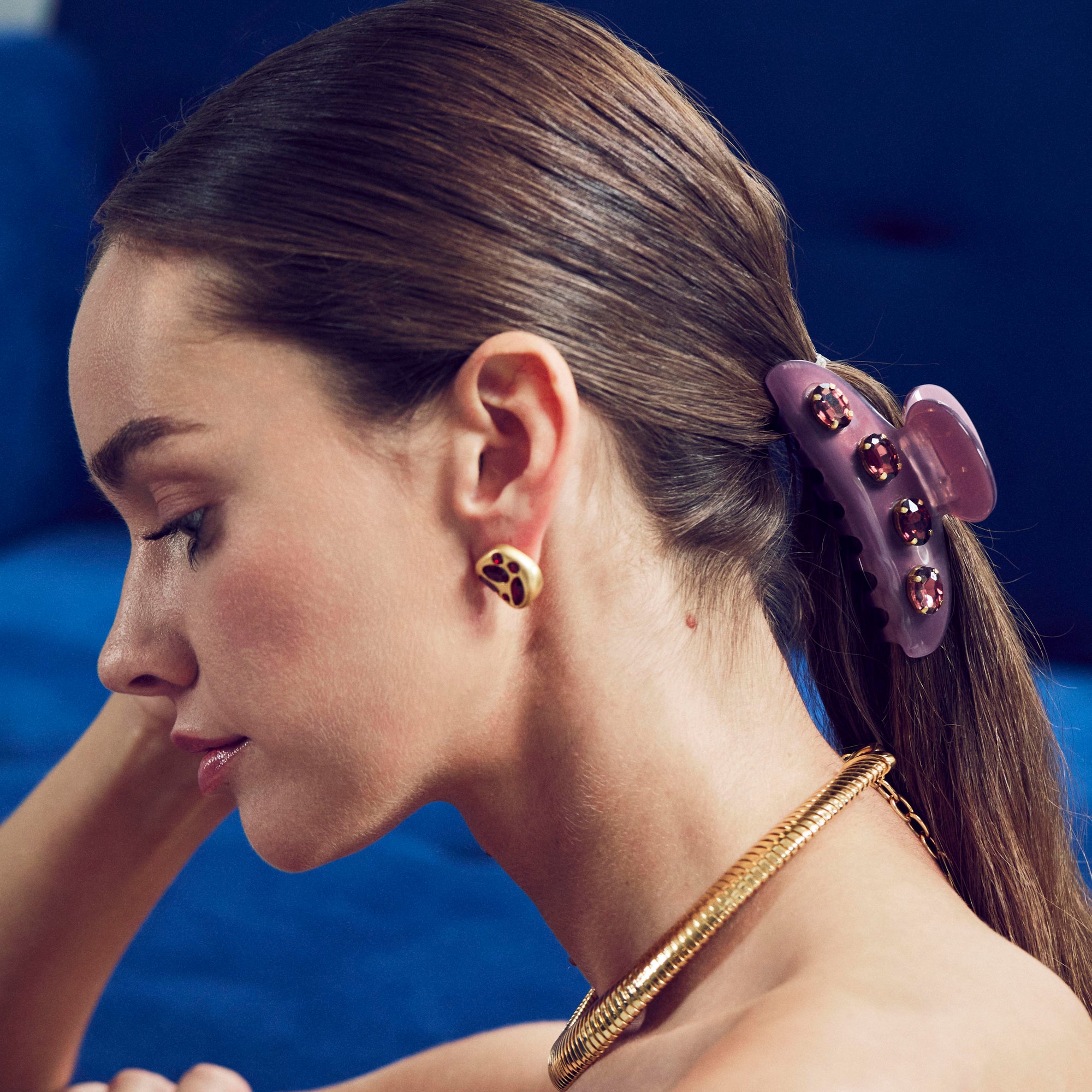 ∙ Mauve acetate∙ Hand-set oval mauve crystals∙ 14k gold-plated settings∙ Measures 4 1/2" by 2"∙ Trademark logo charm∙ Store in resealable striped plastic pouch
