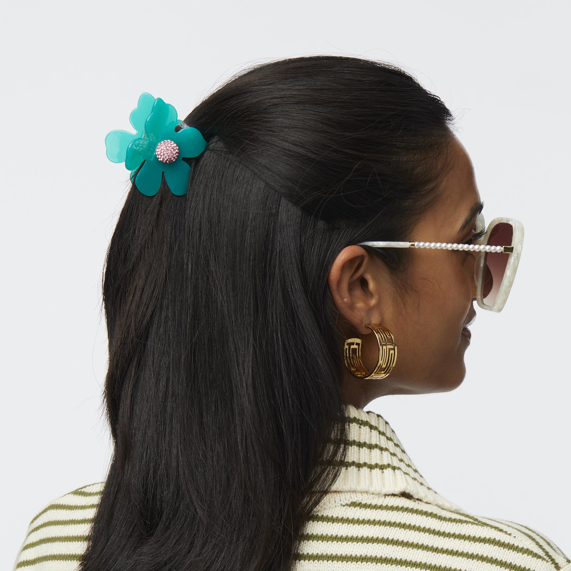 ∙ Turquoise sea acetate claw clip∙ 1/2" pink pave crystal center∙ Measures 2" x 2” by 1" width∙ Trademark logo charm∙ Spot clean